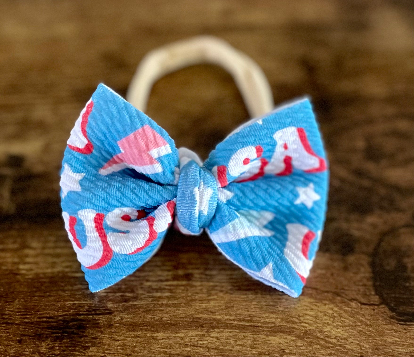 Super soft fabric bow, 2.5 inch, on a stretchy nylon band. Fits newborn to adults. Perfect for newborns or those looking for a smaller accessory!