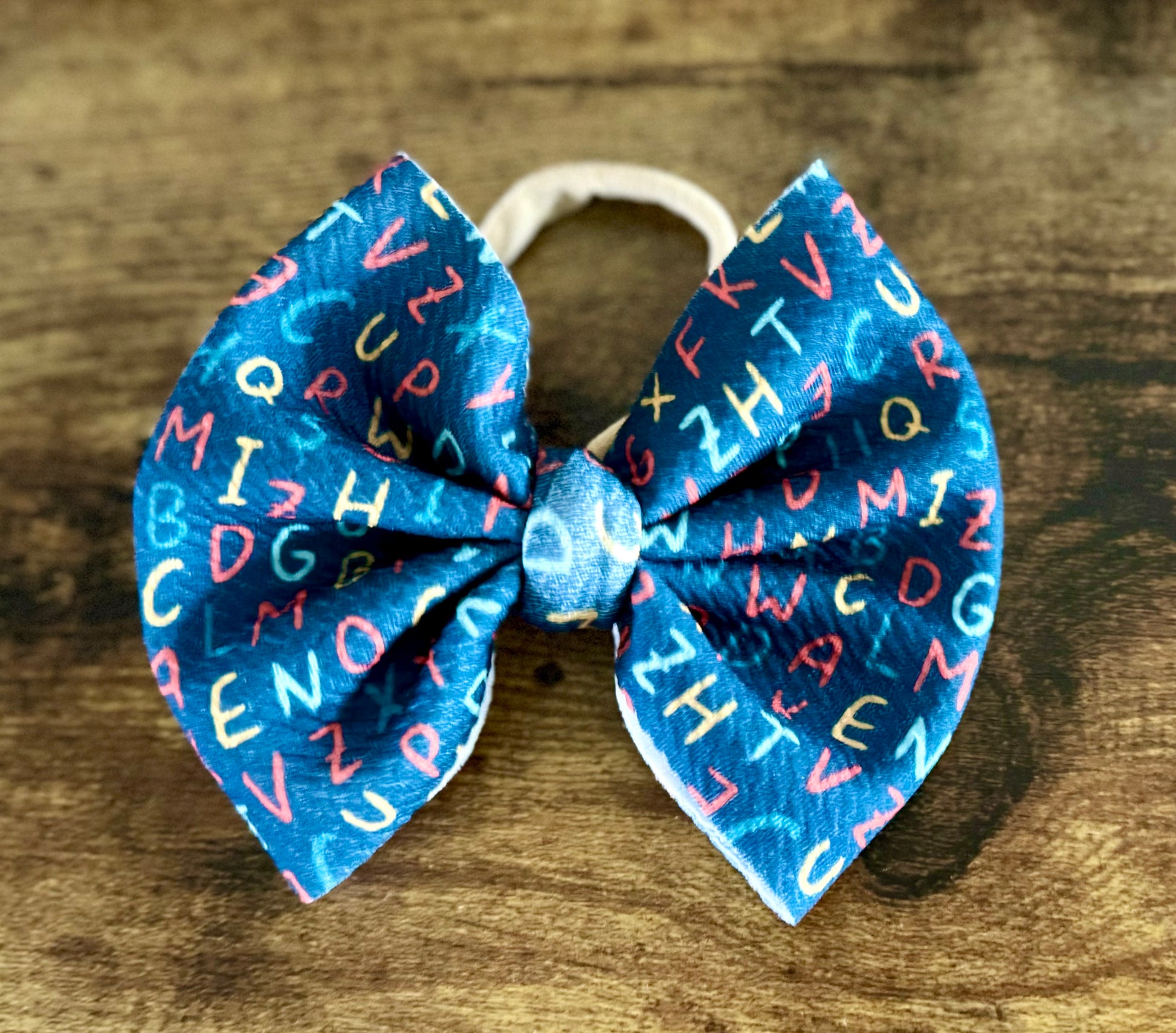 Super soft five inch fabric bow on a stretchy nylon band. Fits newborn to adults.