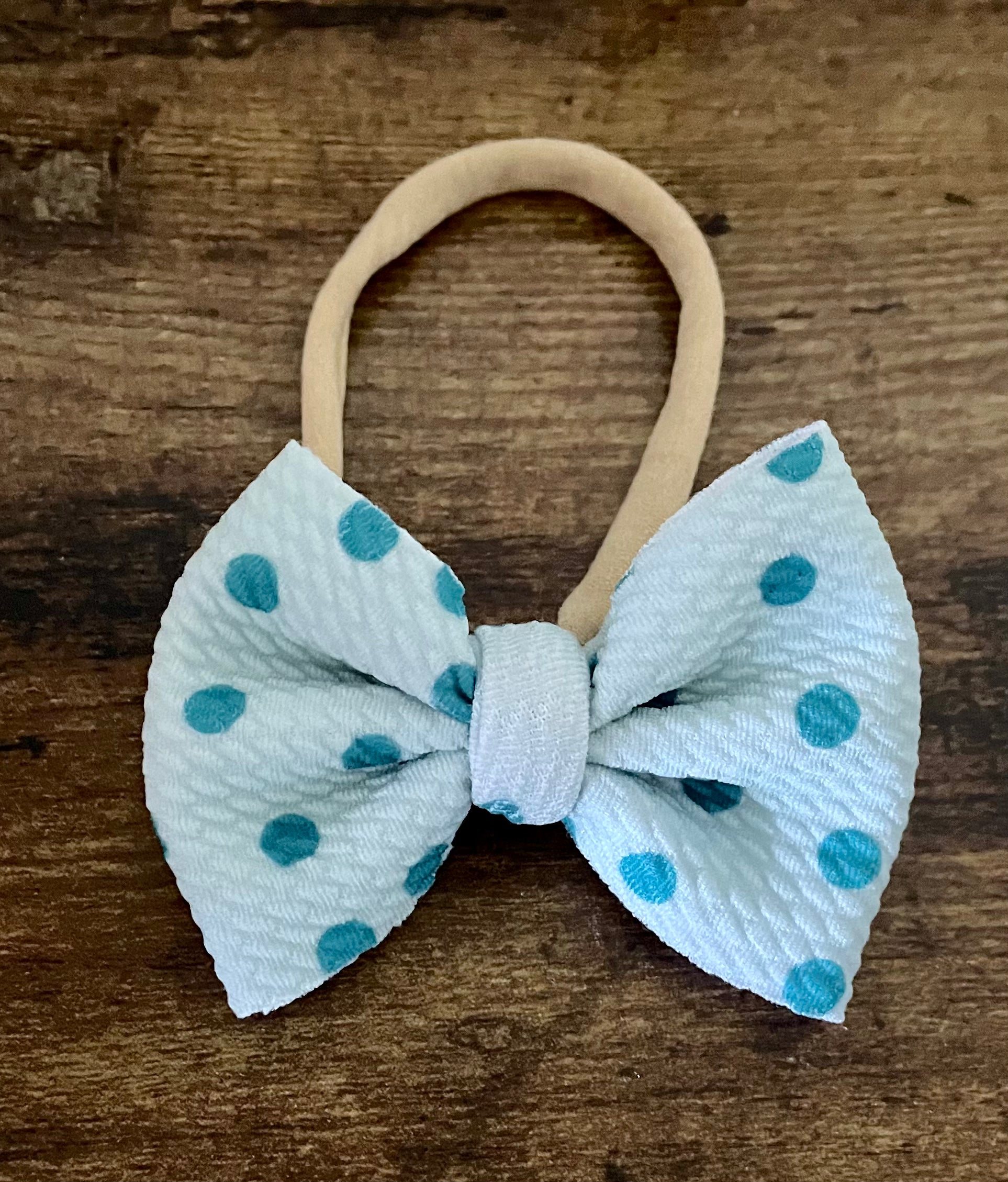 Super soft fabric bow, 2.5 inch, on a stretchy nylon band. Fits newborn to adults. Perfect for newborns or those looking for a smaller accessory!