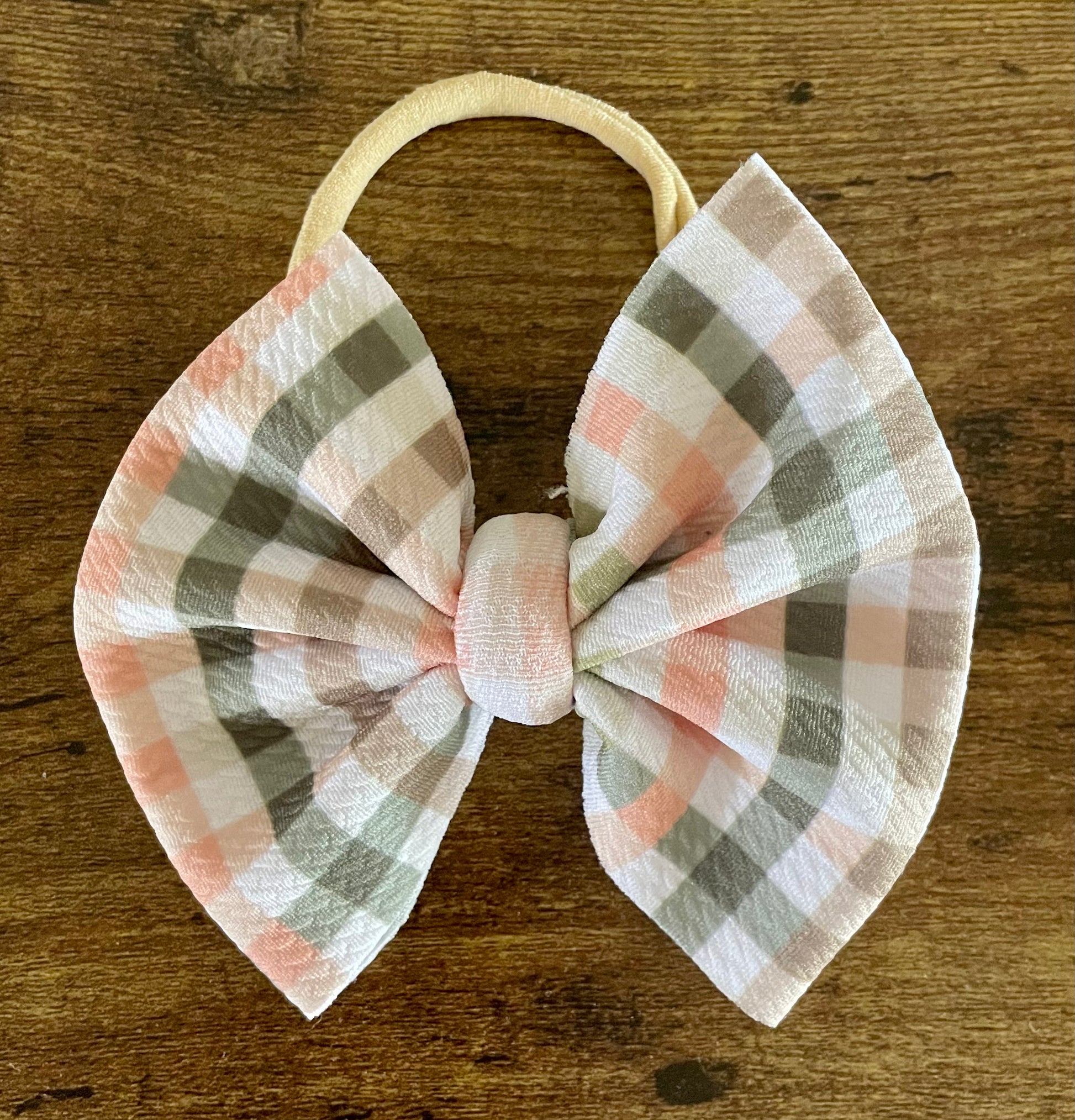 Super soft five inch fabric bow on a stretchy nylon band. Fits newborn to adults.