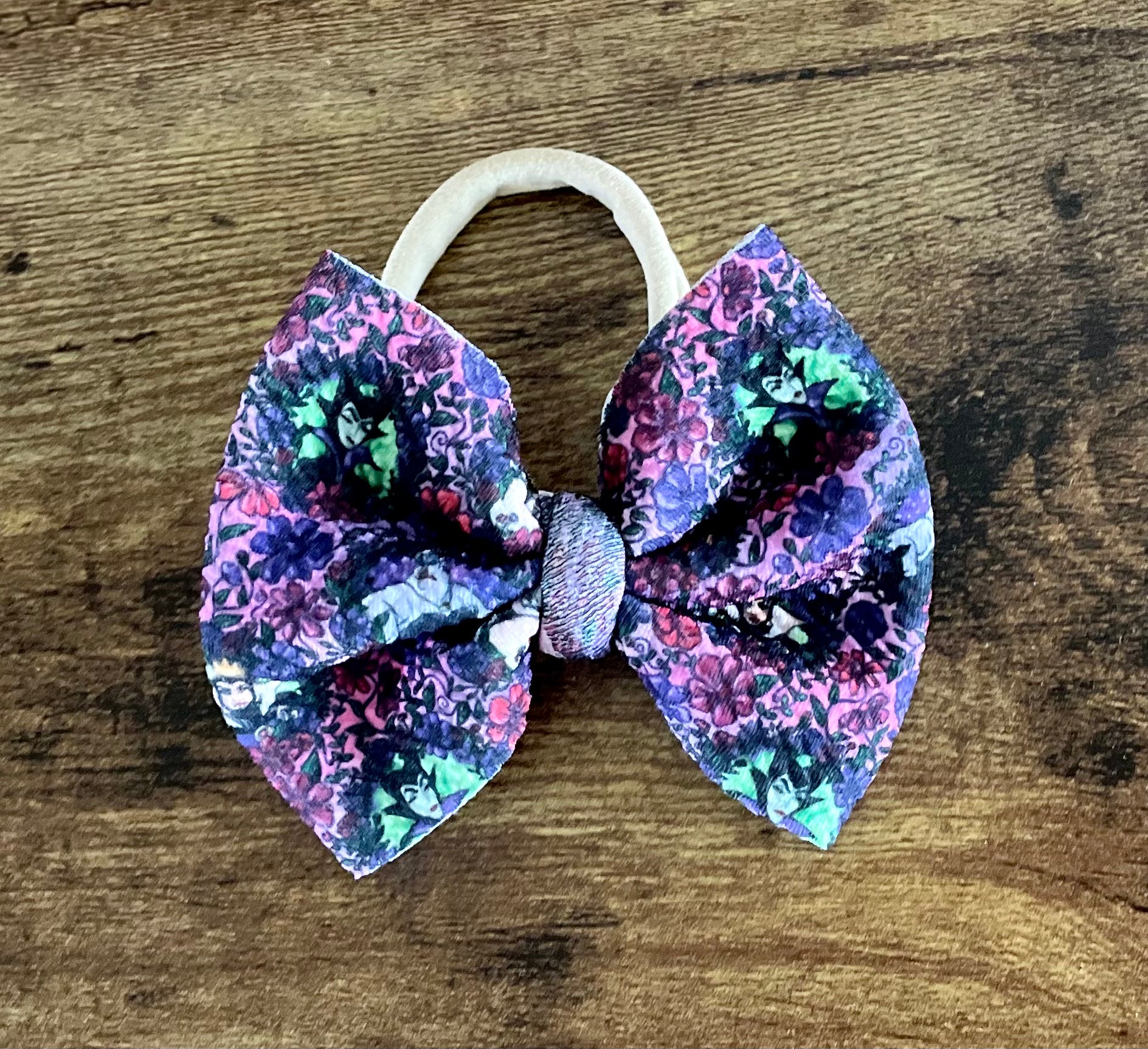 Super soft fabric bow on a stretchy nylon band. Fits newborn to adults.