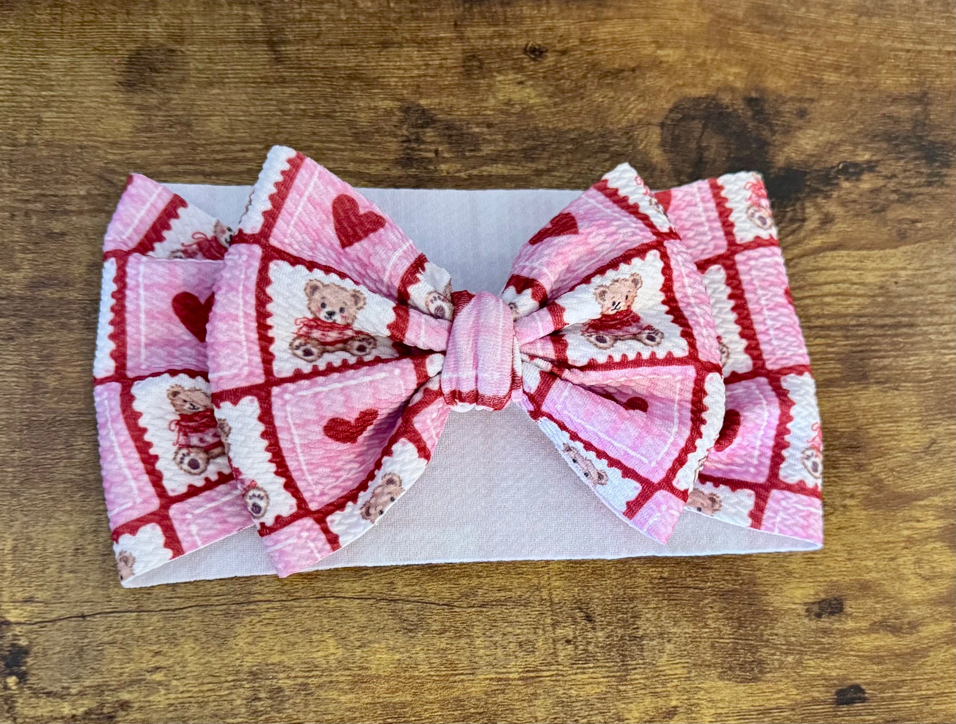 Super soft, stretchy fabric head wrap bow. Fits best ~3 months to 3 years.