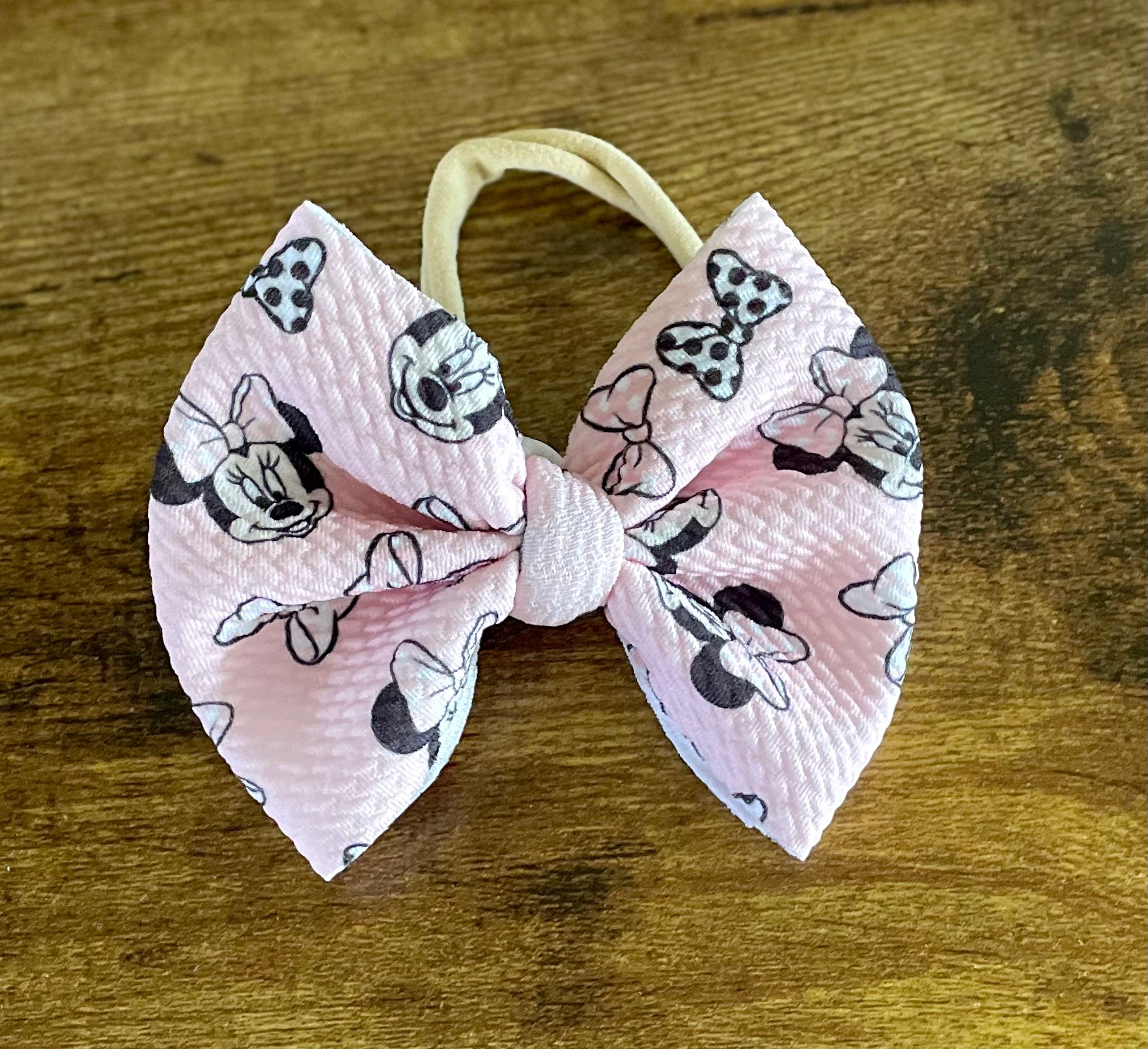 Super soft fabric bow on a stretchy nylon band. Fits newborn to adults.