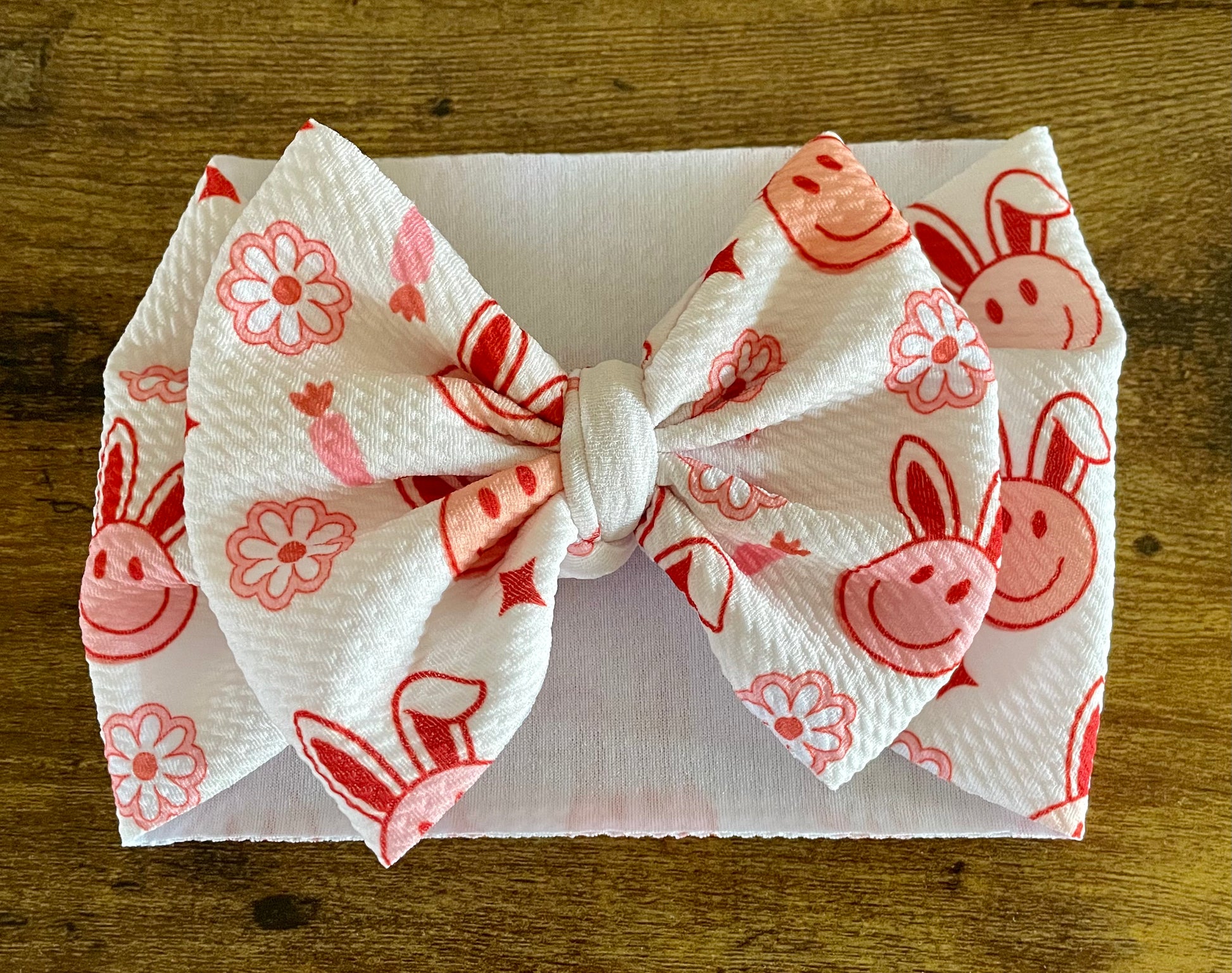 Super soft, stretchy fabric head wrap bow. Fits best ~3 months to 3 years.