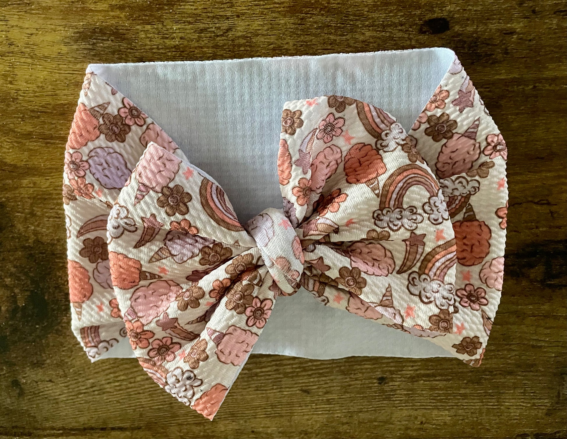 Super soft, stretchy fabric head wrap bow. Fits best ~3 months to 3 years.