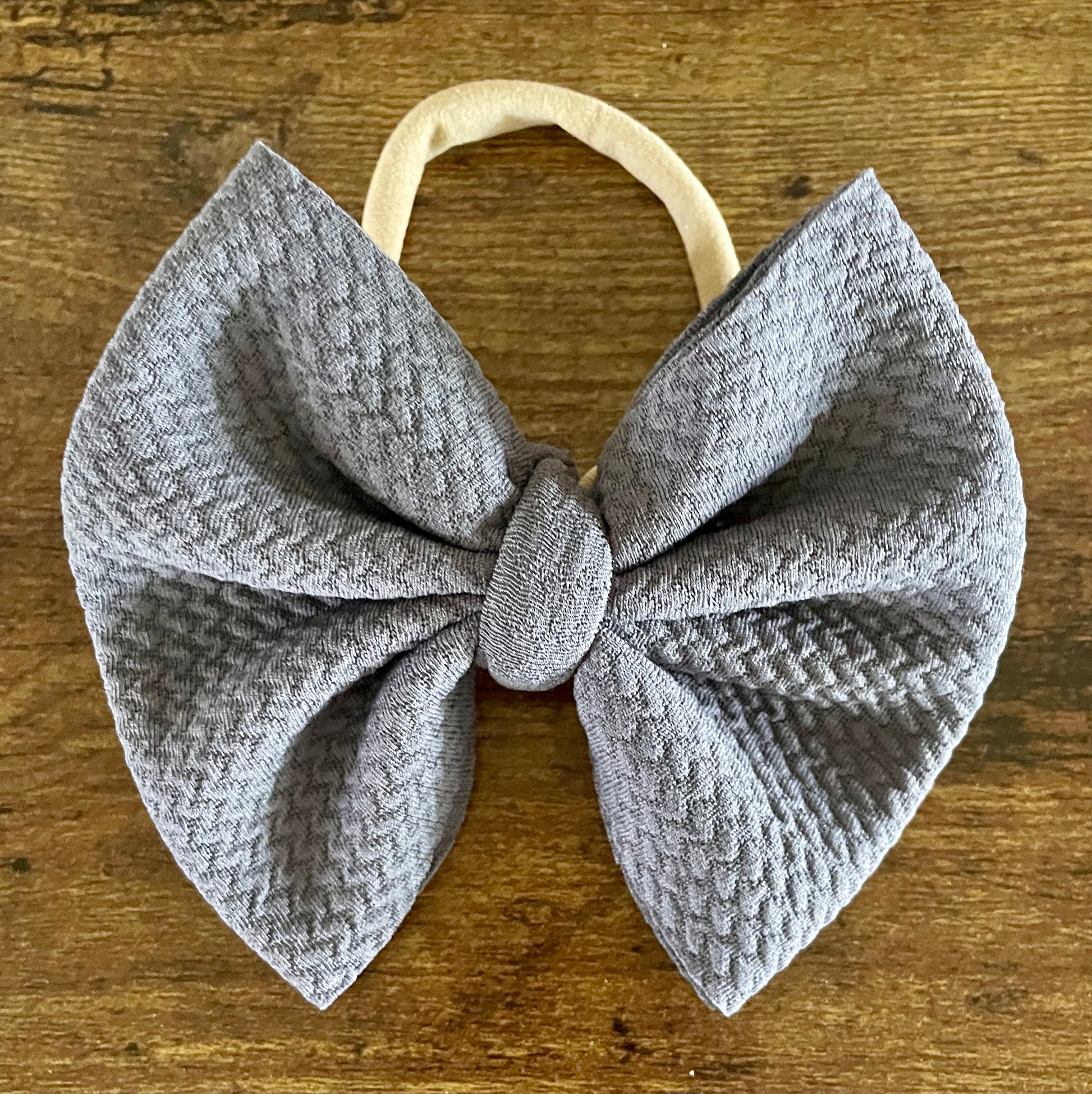 Super soft five inch fabric bow on a stretchy nylon band. Fits newborn to adults.