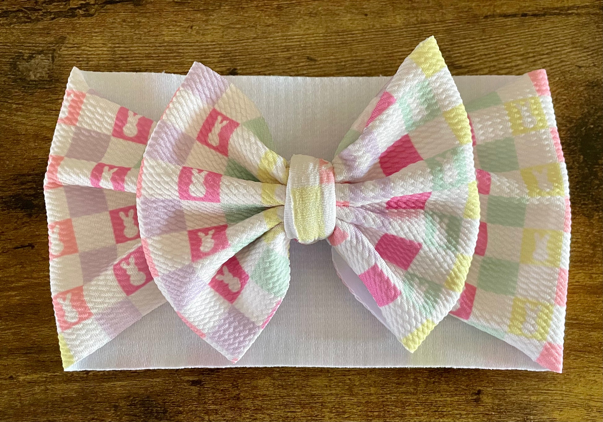 Super soft, stretchy fabric head wrap bow. Fits best ~3 months to 3 years.