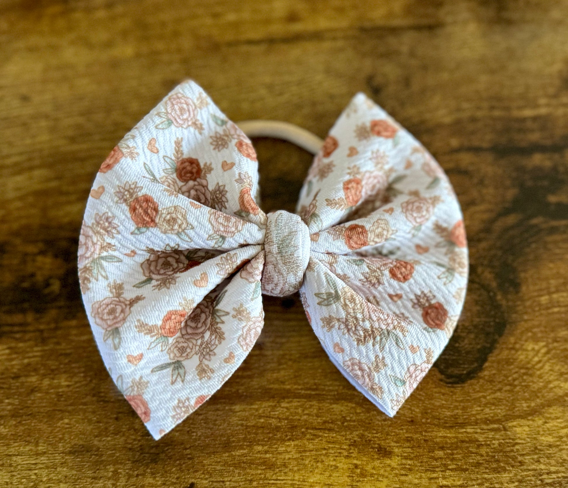 Super soft five inch fabric bow on a stretchy nylon band. Fits newborn to adults.