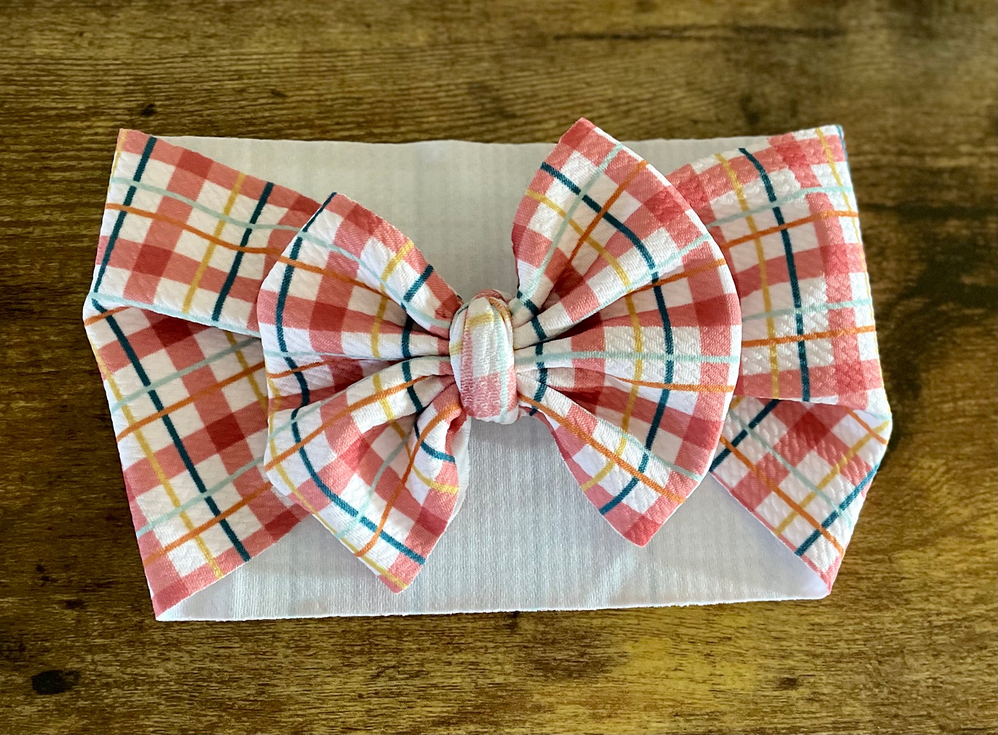 Super soft, stretchy fabric head wrap bow. Fits best ~3 months to 3 years.
