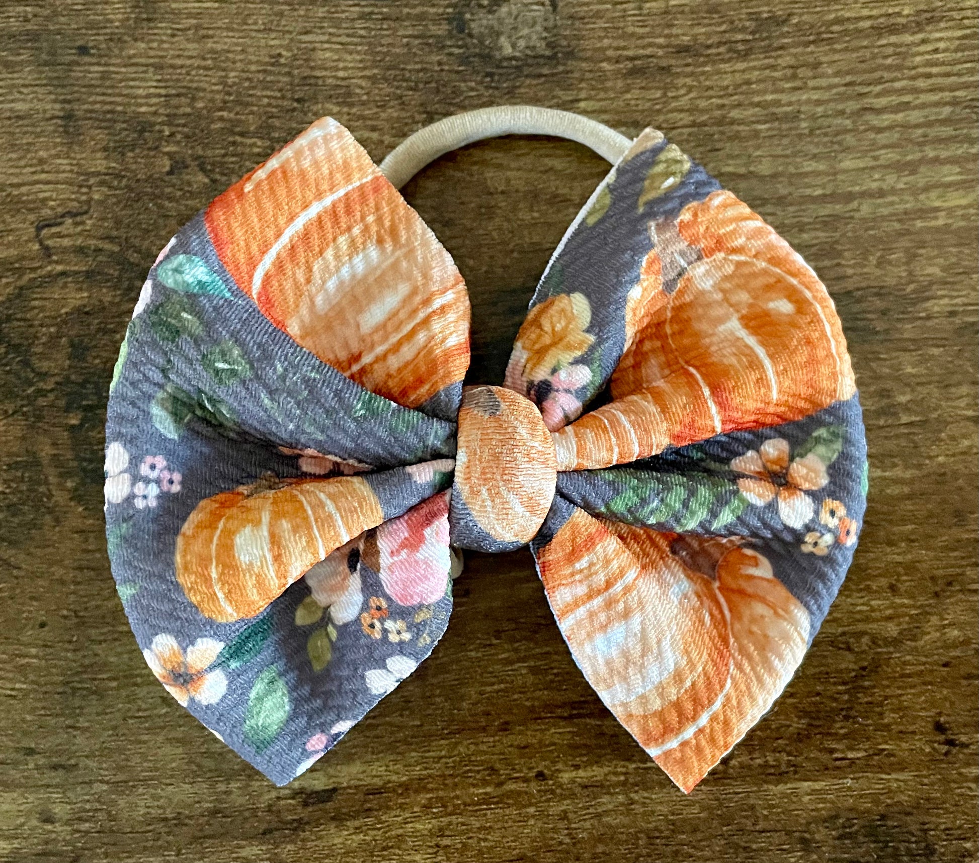 Super soft five inch fabric bow on a stretchy nylon band. Fits newborn to adults.