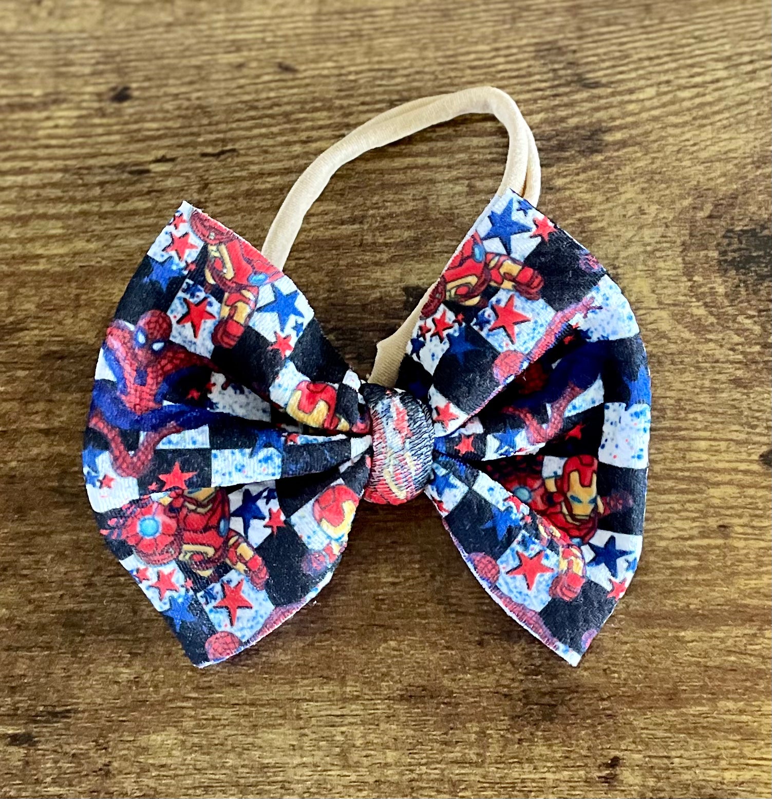 Super soft fabric bow on a stretchy nylon band. Fits newborn to adults.