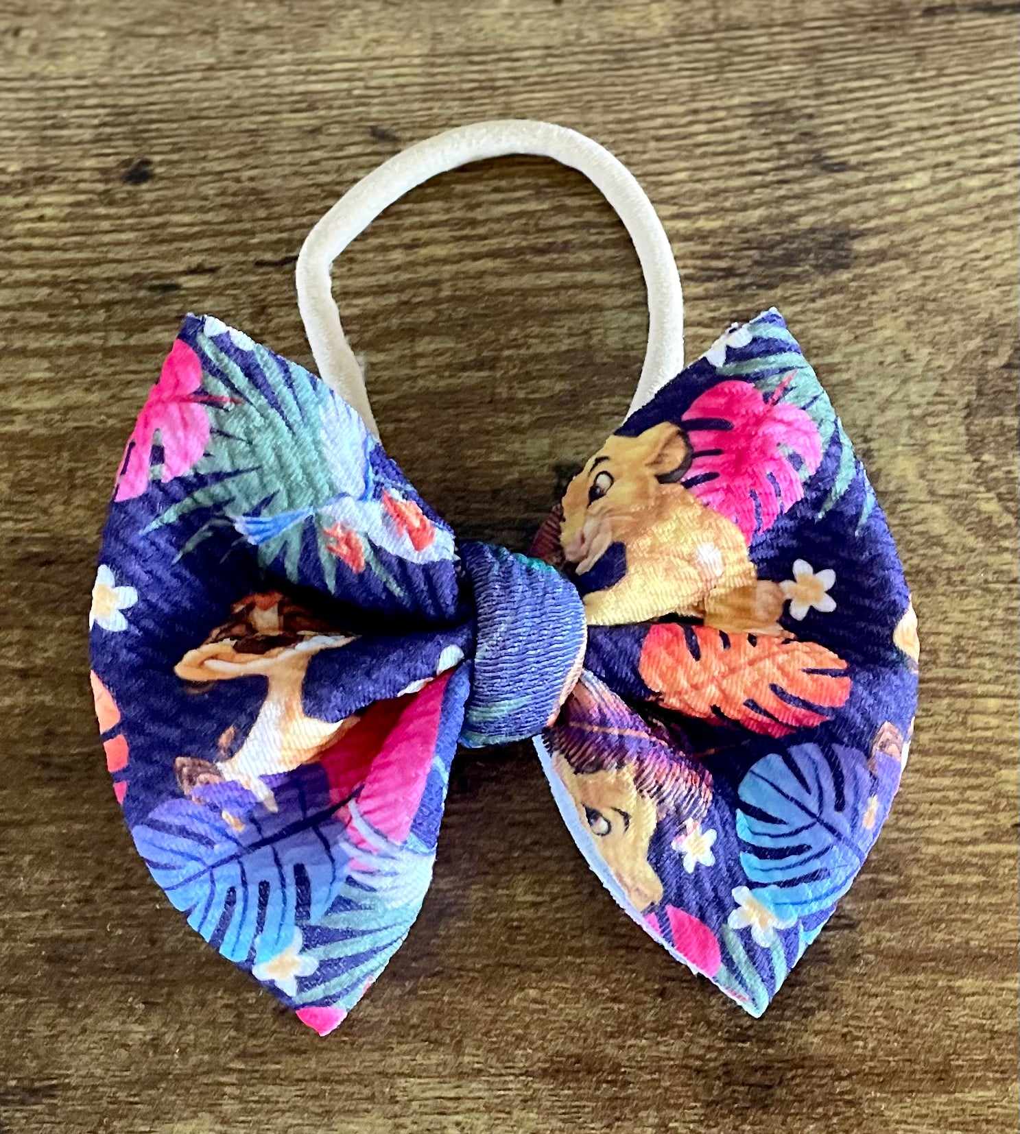 Super soft fabric bow on a stretchy nylon band. Fits newborn to adults.