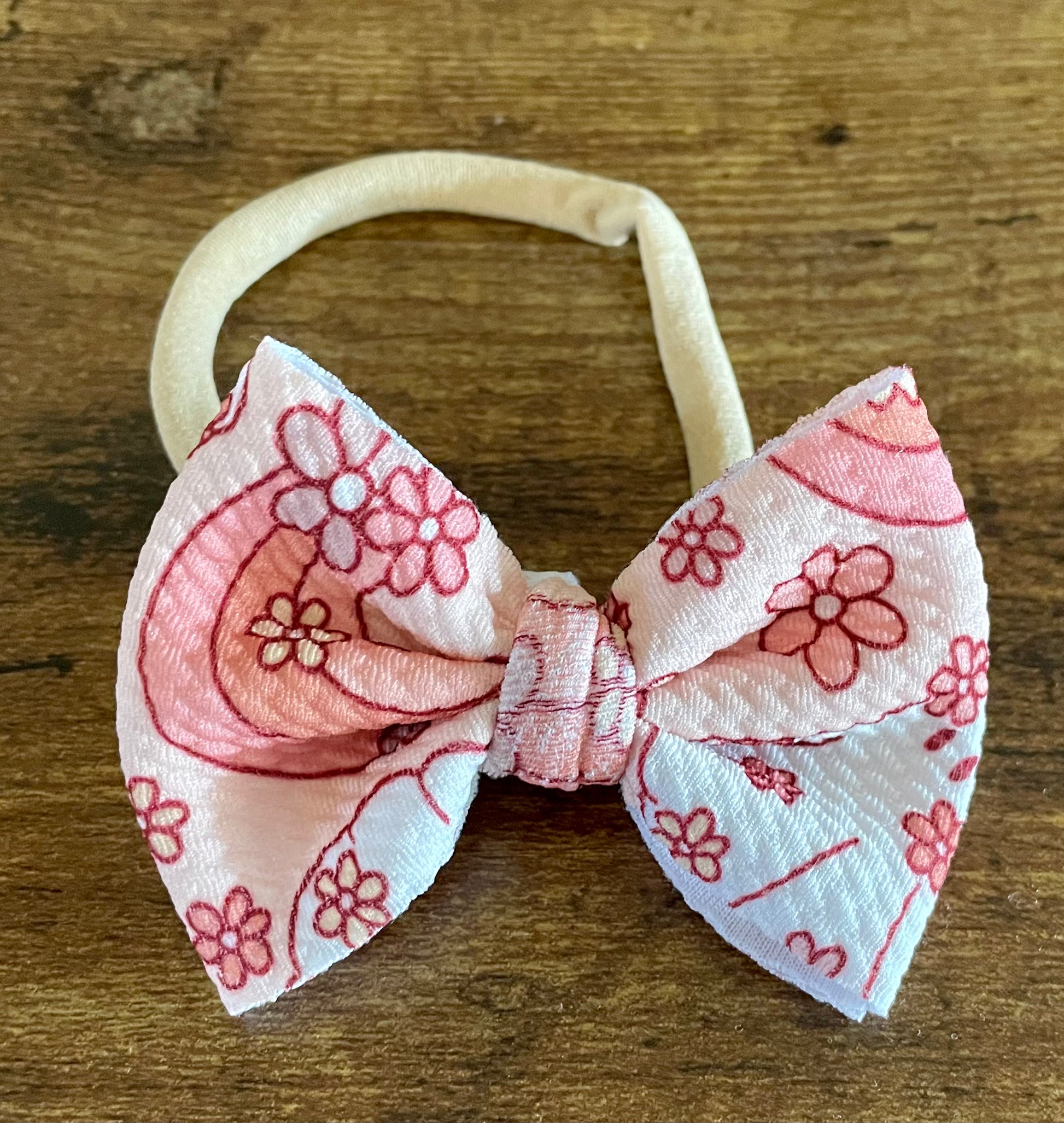 Super soft fabric bow, 2.5 inch, on a stretchy nylon band. Fits newborn to adults. Perfect for newborns or those looking for a smaller accessory!