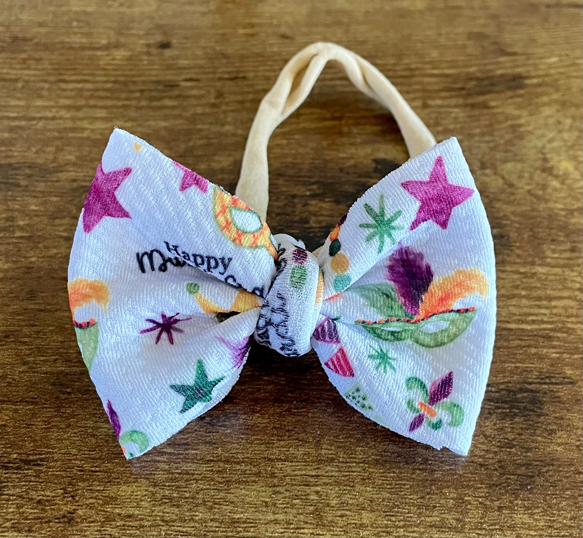 Super soft fabric bow, 2.5 inch, on a stretchy nylon band. Fits newborn to adults. Perfect for newborns or those looking for a smaller accessory!