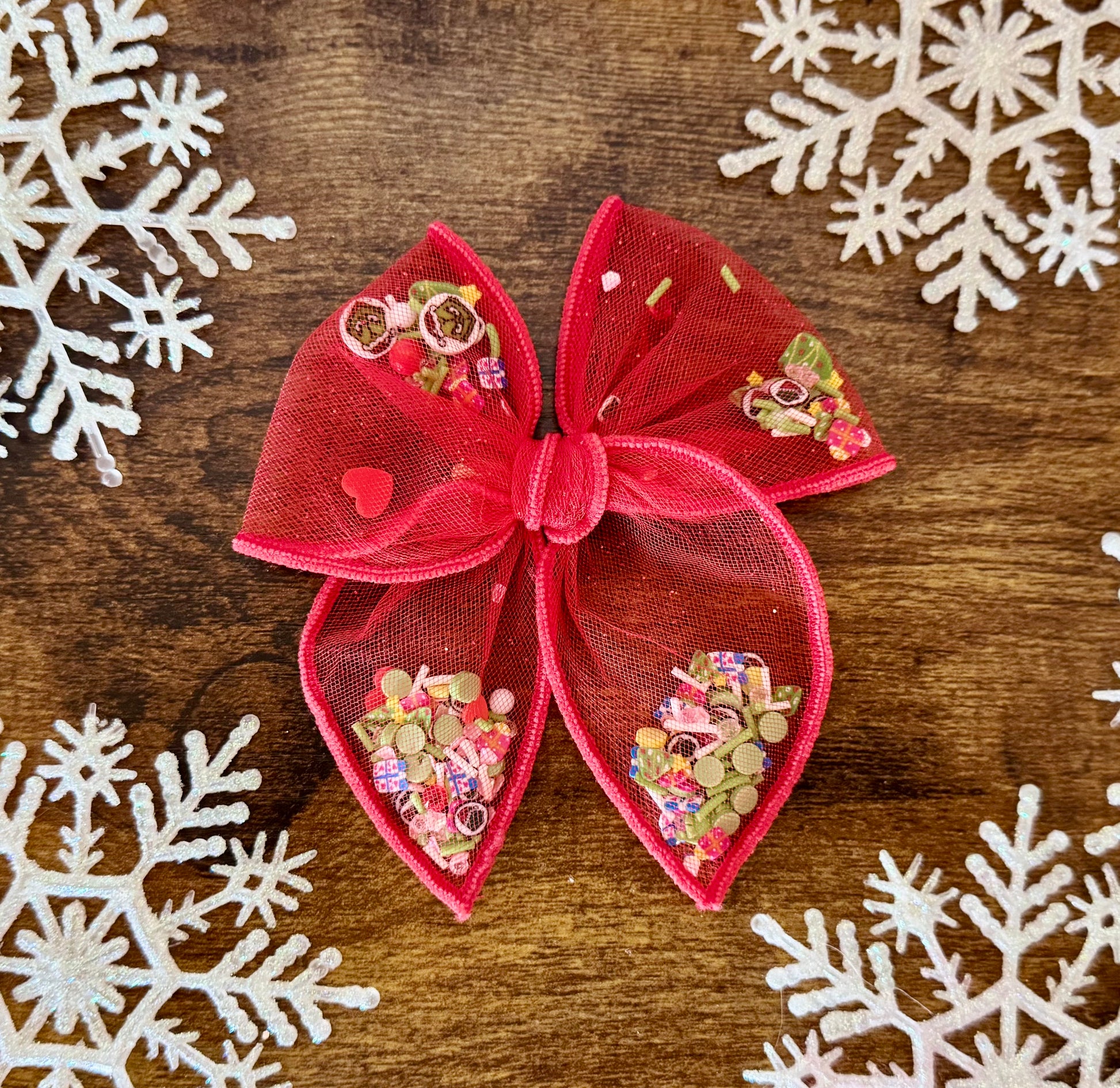 Hand-tied sailor-style bow on clip. Approximately 4 inches wide and 3.5 inches long.