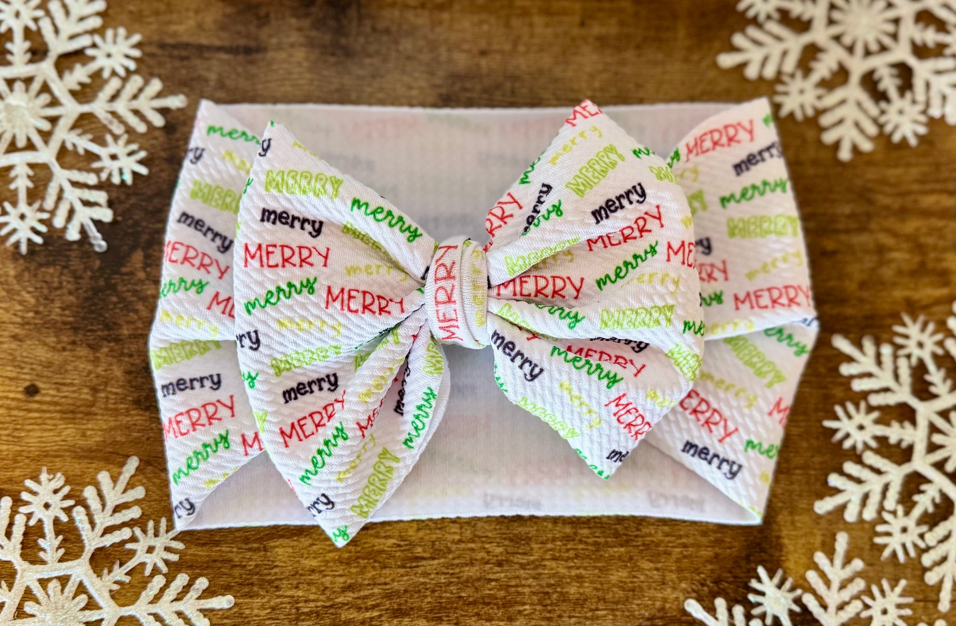 Super soft, stretchy fabric head wrap bow. Fits best ~3 months to 3 years.