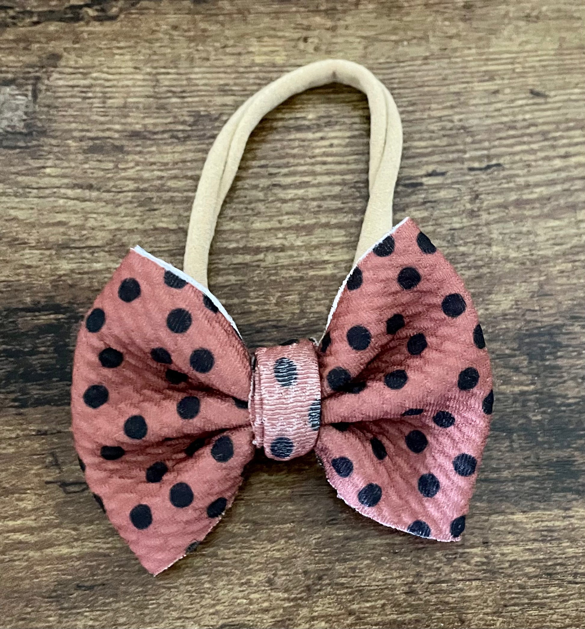 Super soft fabric bow, 2.5 inch, on a stretchy nylon band. Fits newborn to adults. Perfect for newborns or those looking for a smaller accessory!
