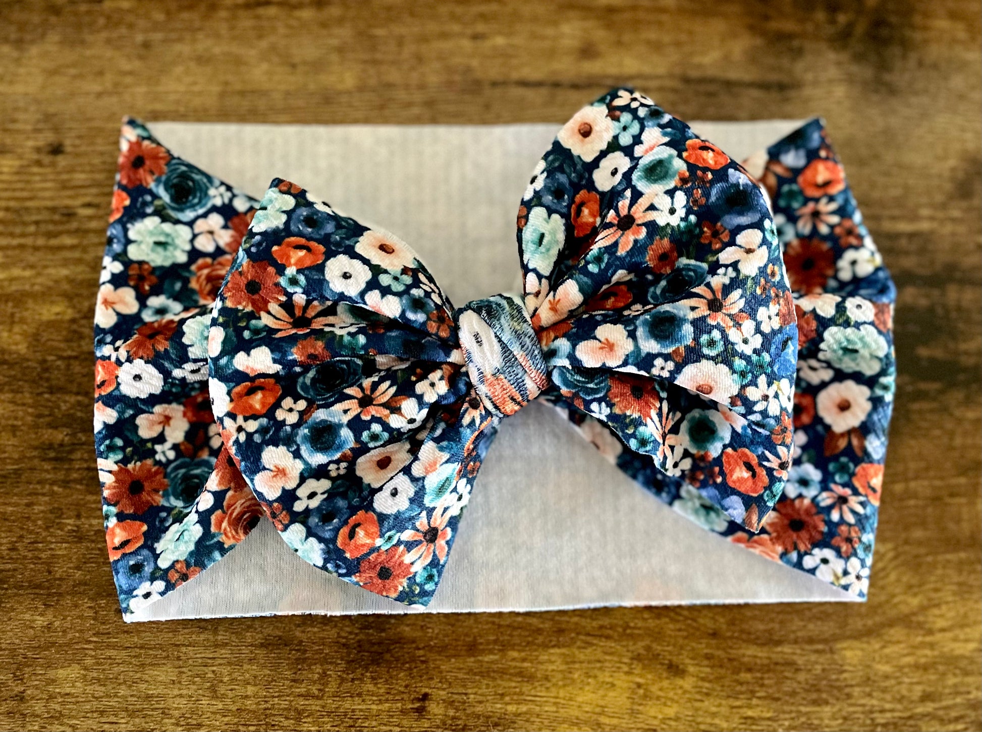 Super soft, stretchy fabric head wrap bow. Fits best ~3 months to 3 years.