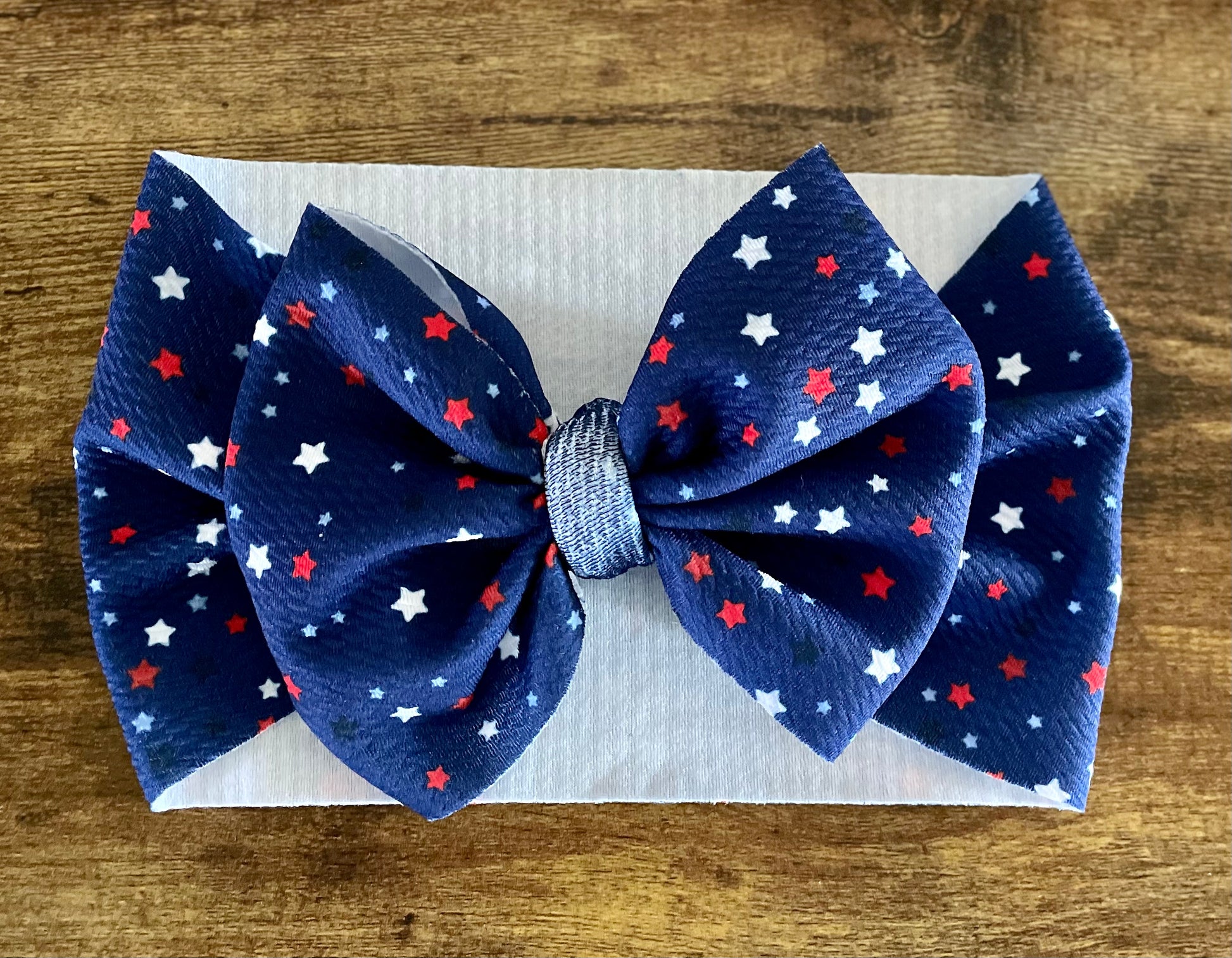 Super soft, stretchy fabric head wrap bow. Fits best ~3 months to 3 years.