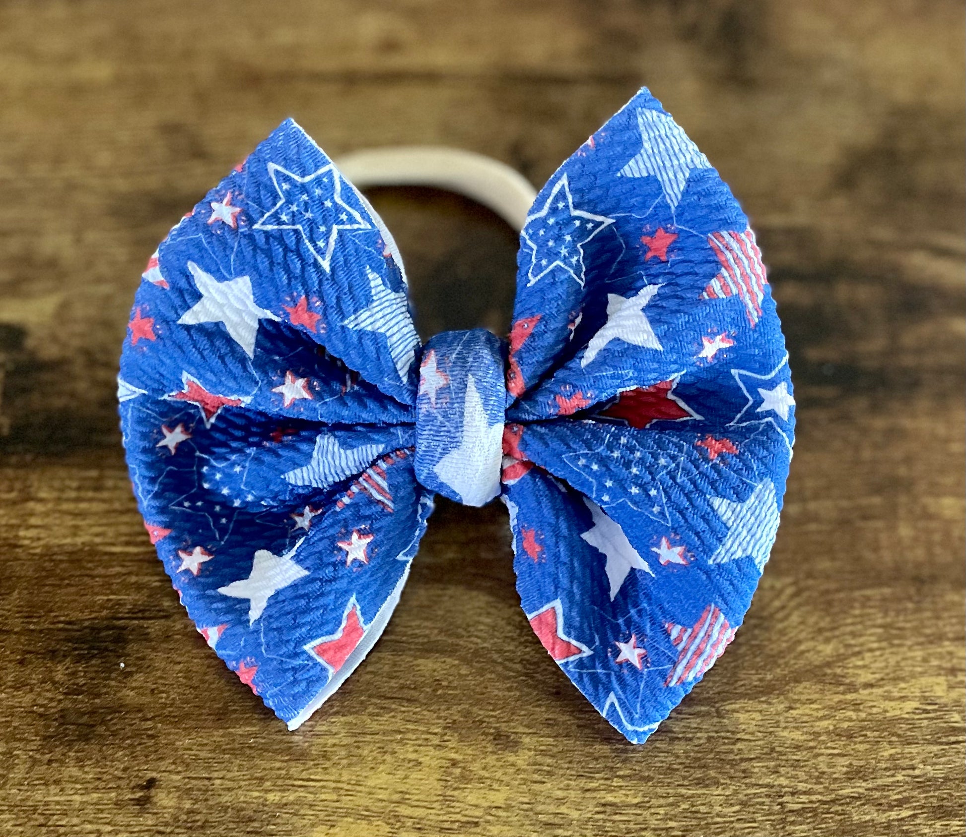 Super soft five inch fabric bow on a stretchy nylon band. Fits newborn to adults.