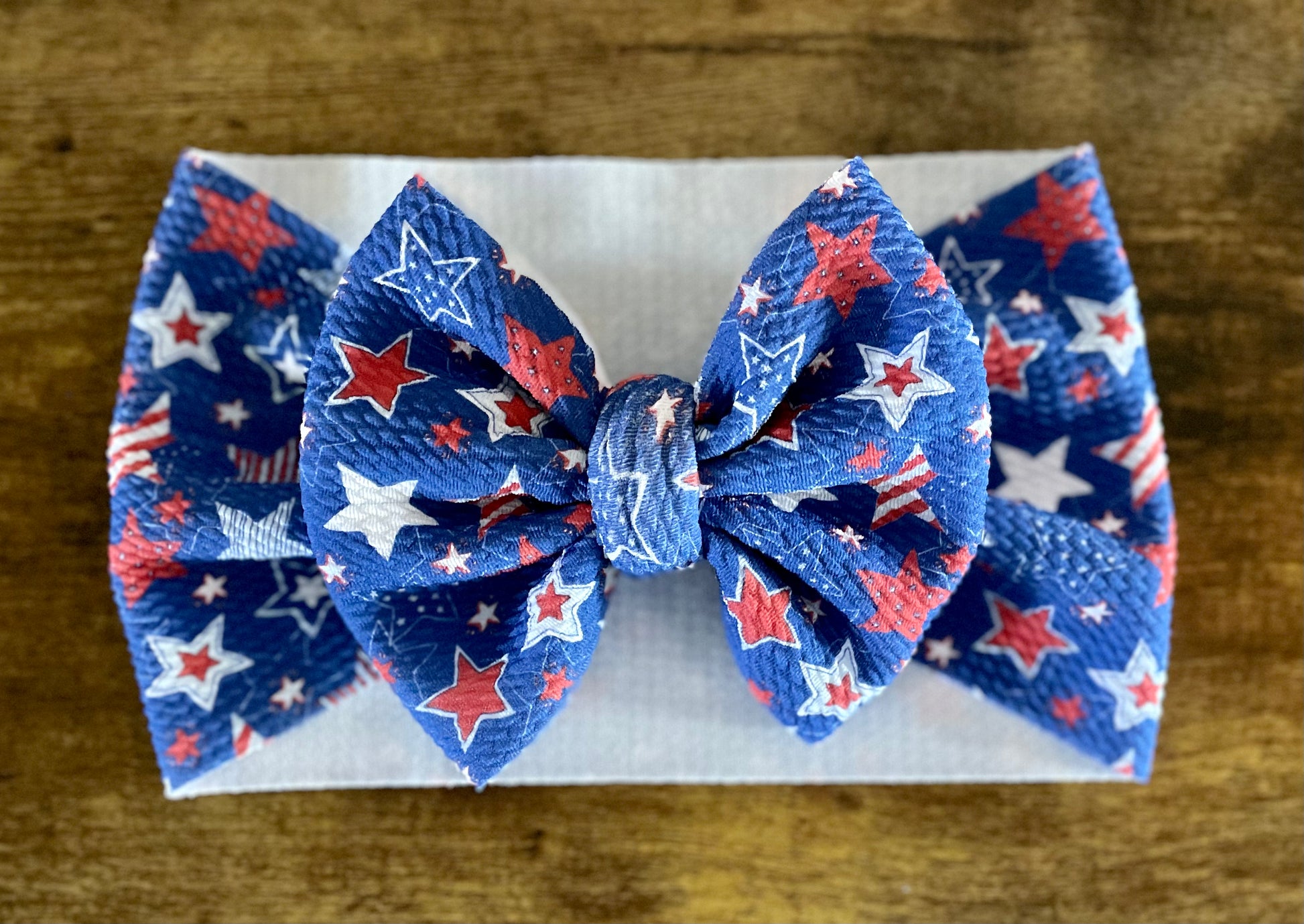 Super soft, stretchy fabric head wrap bow. Fits best ~3 months to 3 years.