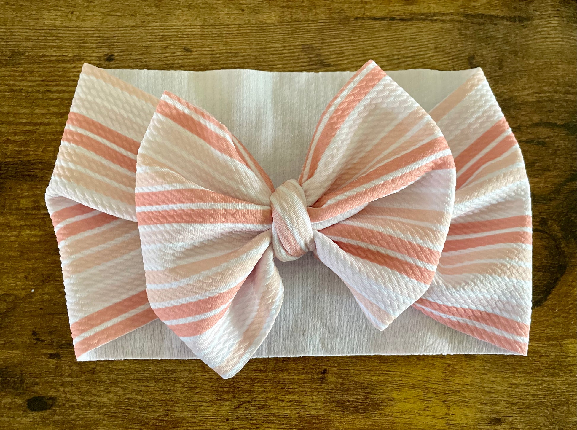 Super soft, stretchy fabric head wrap bow. Fits best ~3 months to 3 years.