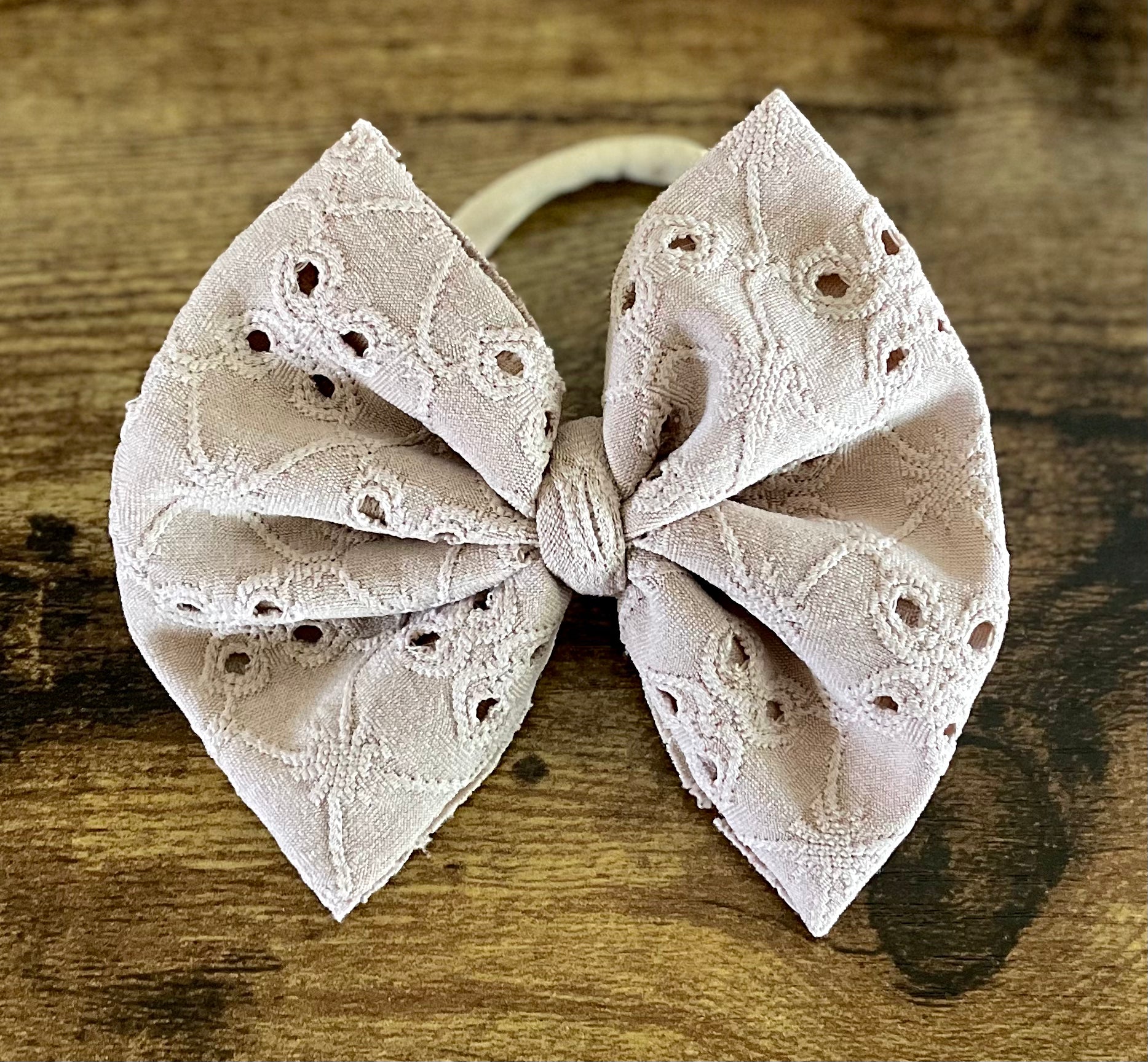 Super soft five inch fabric bow on a stretchy nylon band. Fits newborn to adults.