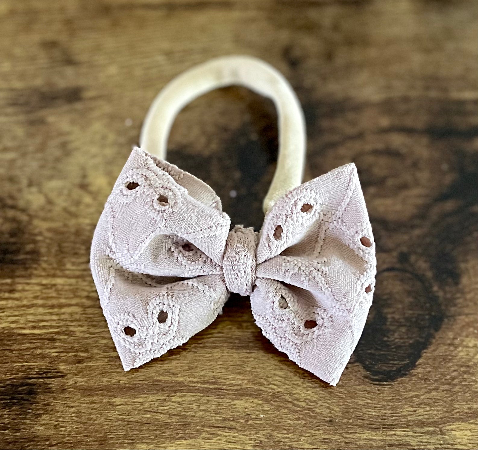 Super soft fabric bow, 2.5 inch, on a stretchy nylon band. Fits newborn to adults. Perfect for newborns or those looking for a smaller accessory!