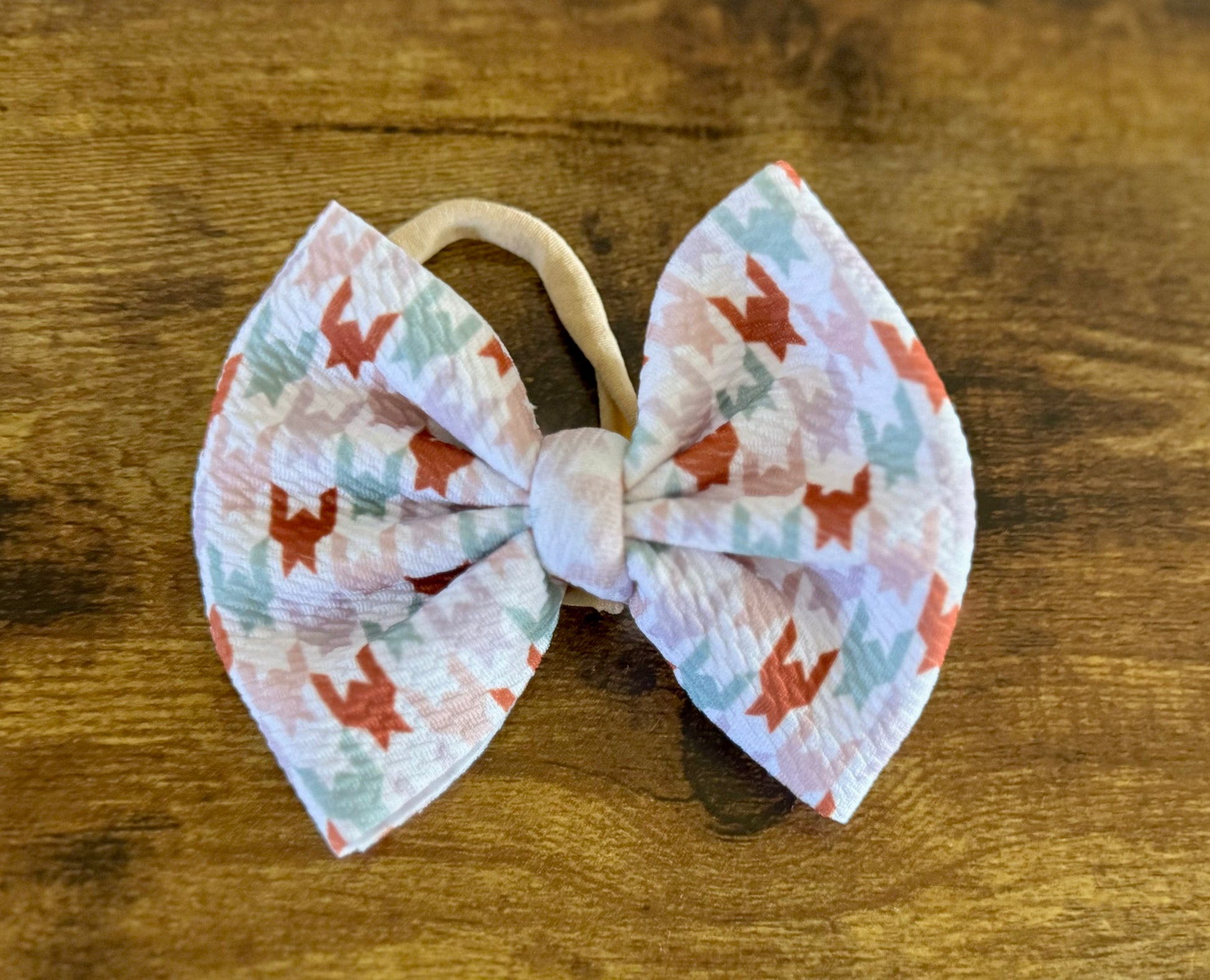 Super soft five inch fabric bow on a stretchy nylon band. Fits newborn to adults.